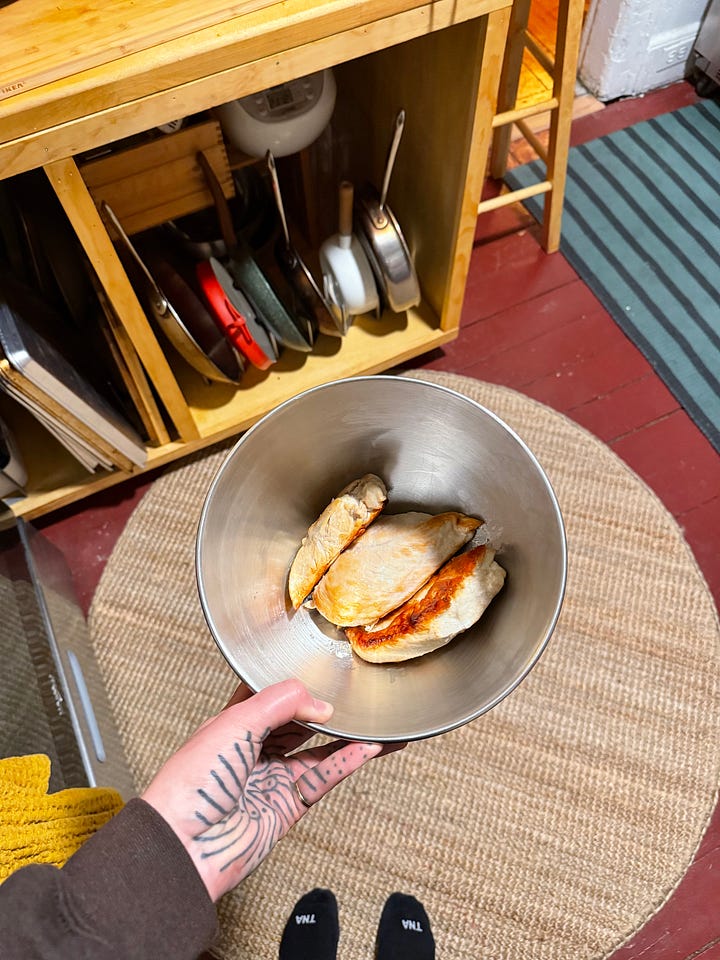 A couple days ago, I had a muscle flare-up that was causing me a lot of pain and limited my mobility in my right arm. I felt really helpless and lonely until Sarah showed up. She arrived with a plate of mortadella sandwiches as she embraced me, sympathizing with my pain. She put a pain relieving patch on my back and prepared a hot water bottle for me as we watched Girls for the nth time and reheated chicken & dumplings.