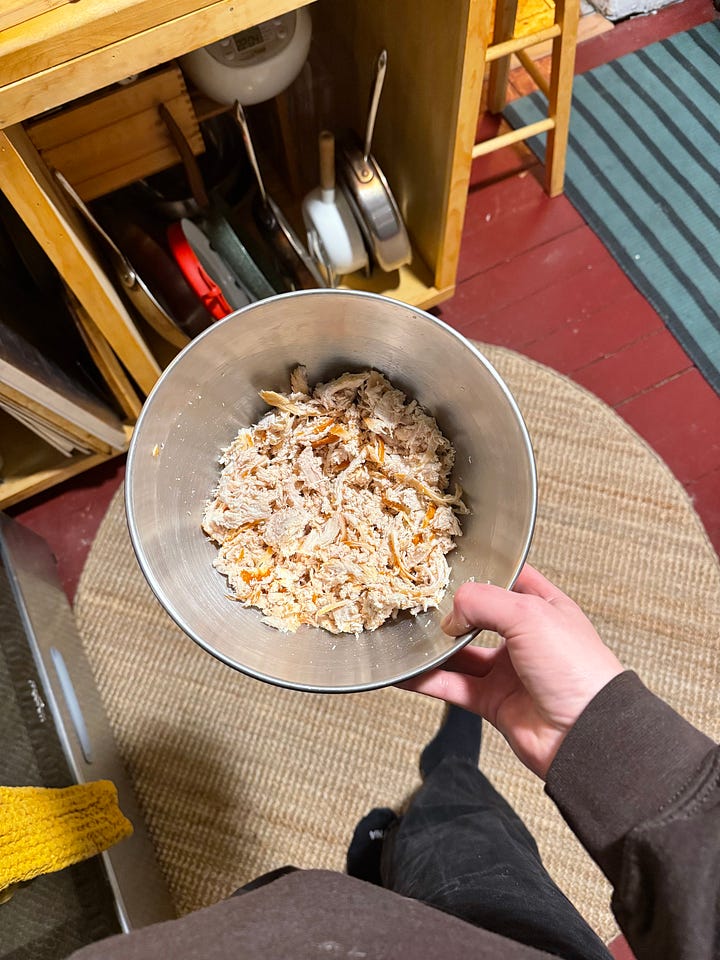 Instead of thickening the stew with flour, you’ll blend up some roasted kabocha squash with the broth and mirepoix to make a hearty, layered base that balances the biscuit-like dumplings. If you have the bandwidth, roast the seeds from the squash with salt & pepper for a tasty autumnal snack. I also use a fun time saving hack to shred chicken using a stand mixer that I learned on TikTok.