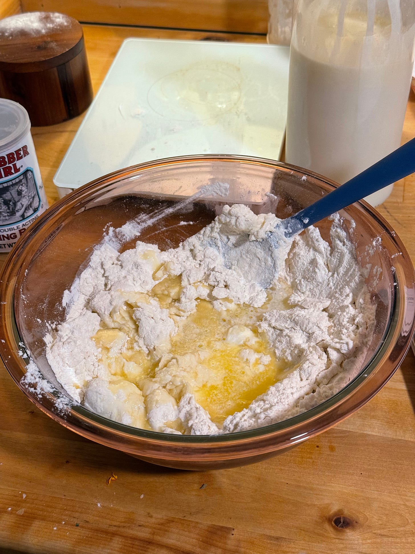 While the soup simmers, prepare your dough for the dumplings by first mixing together your flour, baking powder, baking soda, salt and sugar. Then add sour cream, milk and melted butter. Mix ingredients together gently using a silicone spatula or plastic bench scraper. You want the wet and dry ingredients to just come together. Overmixing will cause your biscuits to be tough. Set dough aside.