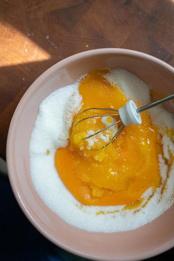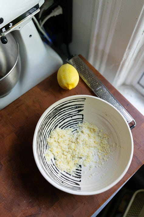 Zest lemon into sugar and massage the zest into the granules until it’s well combined, 1-2 minutes. It should be very fragrant.