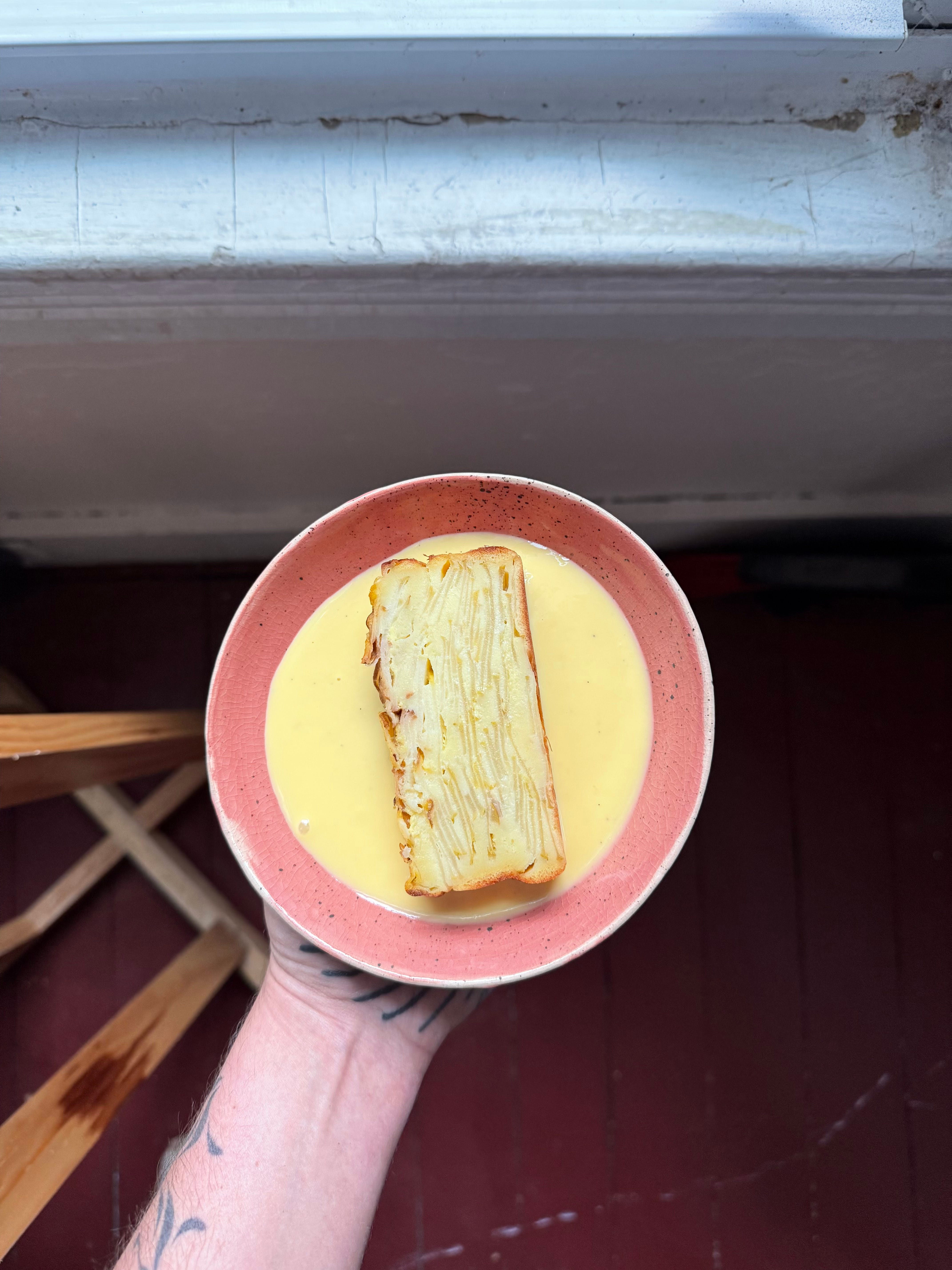 I like to serve this cake cold, sliced in 1 1/2” pieces with a healthy pour of the crème anglaise. I served this at Secret Garden Art Cafe this week with warm masala chai and it was a perfectly cozy taste of fall. I hope you enjoy it and impress yourself making dessert sauce, ‘cause I definitely did.
