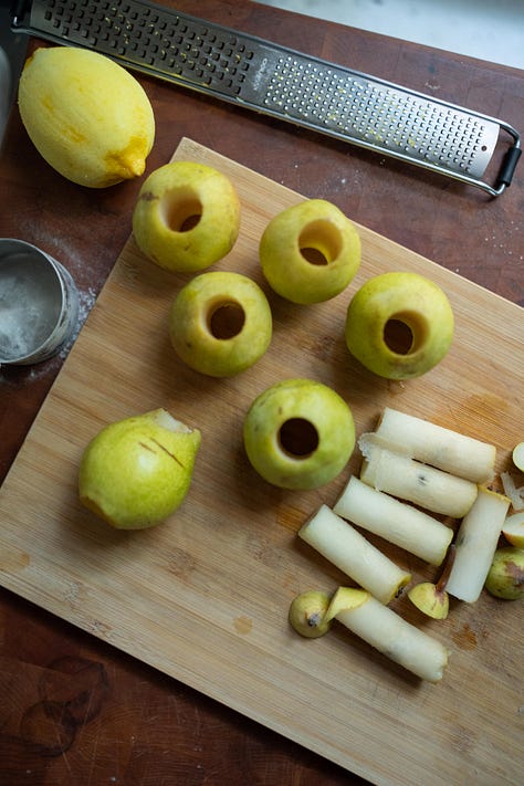 Core pears - I did buy a corer from People’s Restaurant Supply on Gratiot after my fourth cake because doing it with a pairing knife was annoying me. It was $7 and I highly recommend. Slice the cored pears on a mandolin to about 1/8” thick slices and never forget to be *so* careful when using this piece of equipment. Set aside pears.
