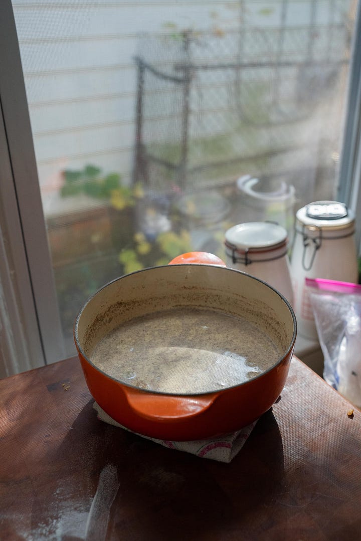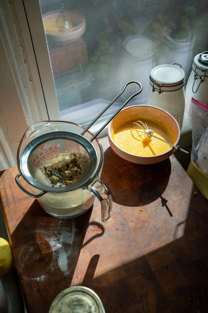 Once your infusion is complete, strain your dairy to remove cardamom pods and/or vanilla pod. Slowly add a little bit of the warm steeped dairy to the eggs to temper the eggs— this will keep them from scrambling.