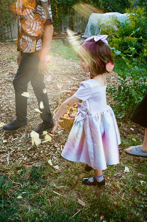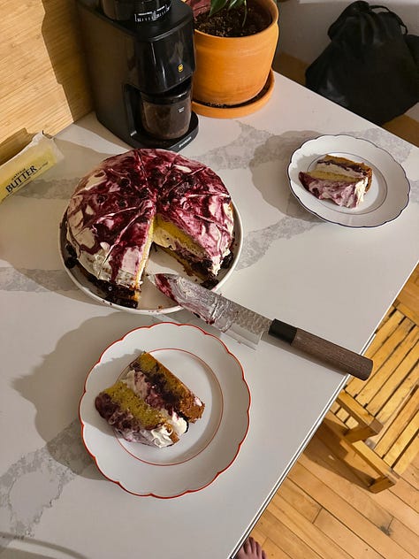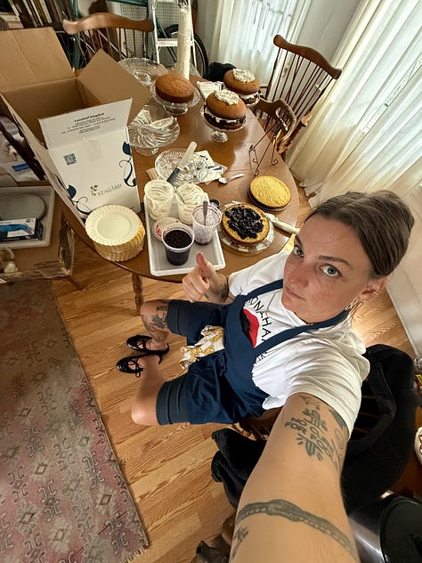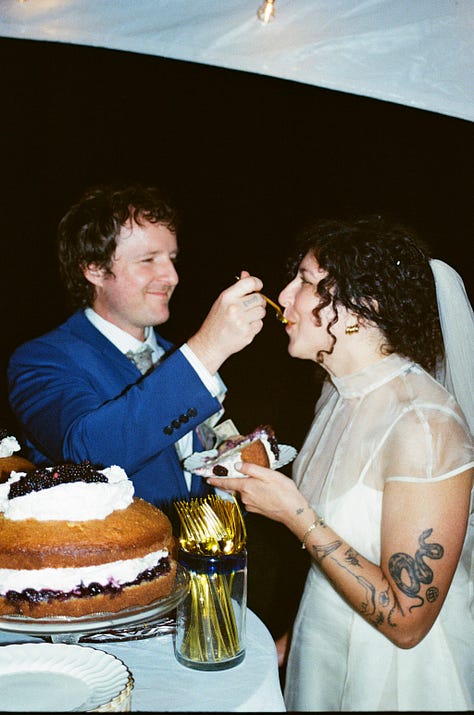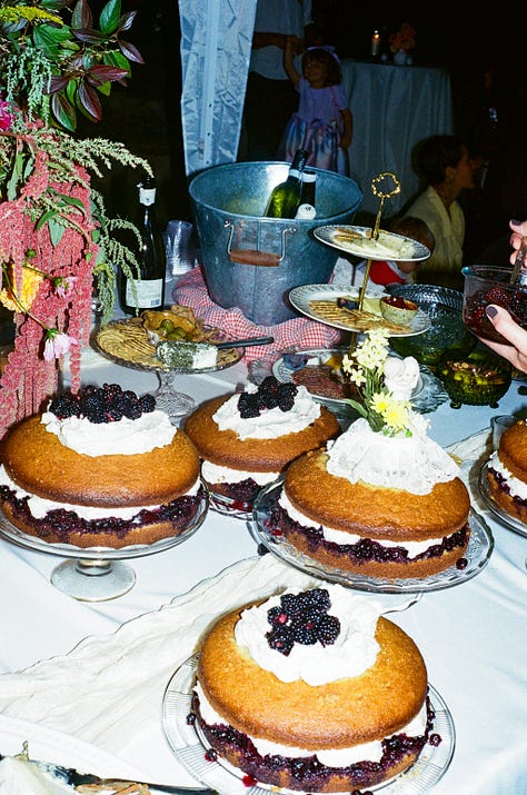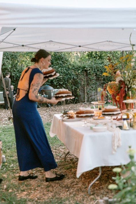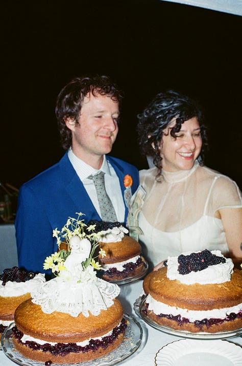 But my greatest cooking accomplishment of the summer was without a doubt the execution of Melissa’s wedding cake(s). In 2023, I made a wedding cake for our friend Jackie & Eric — a simple sponge cake with cream and just harvested strawberries which was the perfect complement to their summer solstice nuptials. The couple raved about it, even the pieces they stuck in the freezer to enjoy a year later for their first anniversary. The experience gave me the audacity to suggest I make Melissa’s cake — it was only double the amount of guests this time, anyway.