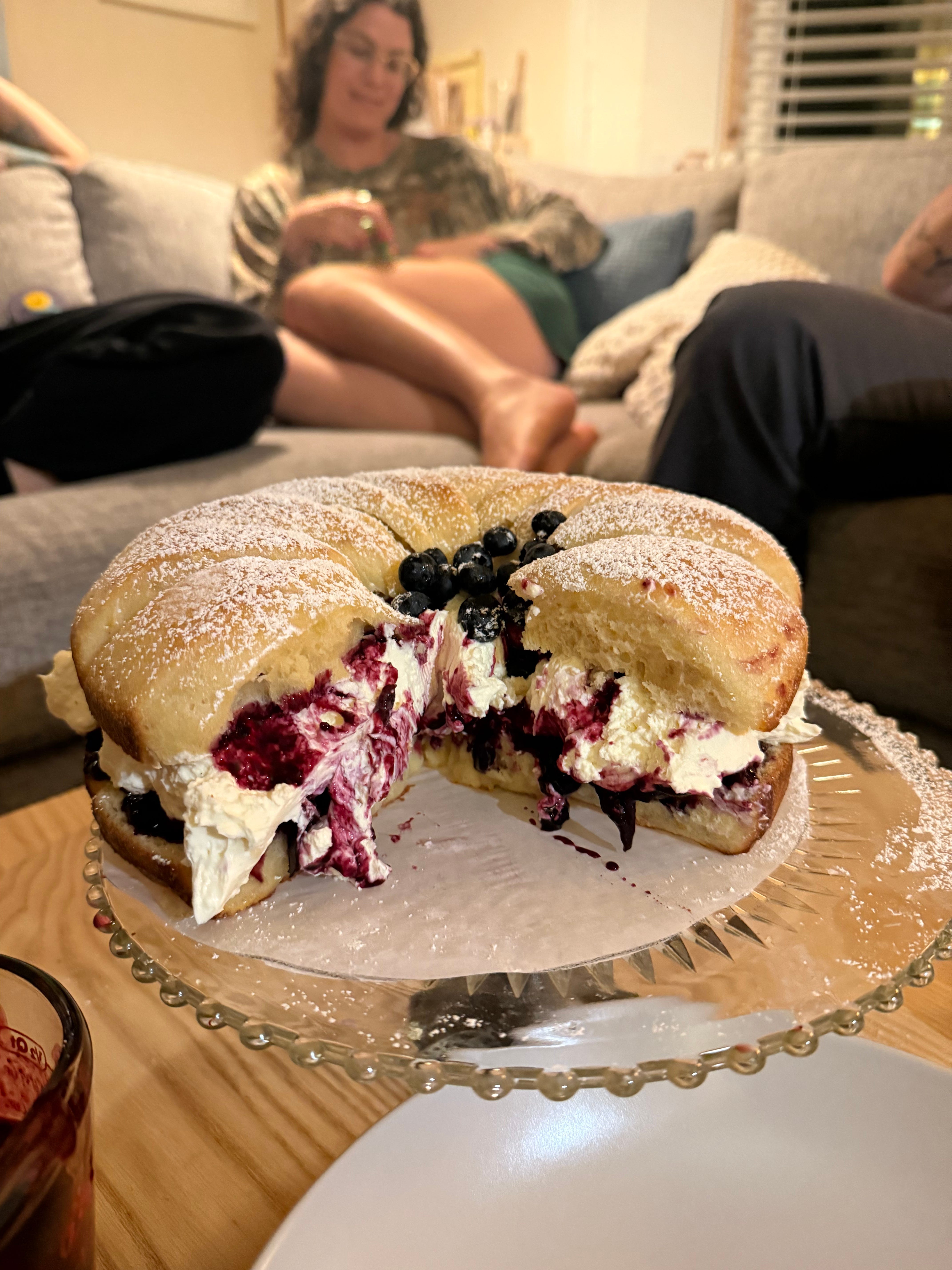 Melissa worked at one of my favorite cafe’s in Detroit that no longer exists that served some of the best olive oil cakes I’ve ever had, so when she asked for an olive oil cake in lieu of the brioche, the stakes were high (for my Capricorn determination). I still wanted the dramatic look of the cream in between cake layers and fruit dripping everywhere, so I essentially just substituted the brioche for cake and used blueberries, plums and blackberries which were prolific in September.